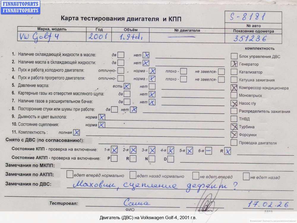 | Ярославль | 2003 | 036100098MX, 2003, 1.4л, Бензин, Инжектор, BCA, BCA181659, 036100098MX, Хэтчбэк 5 дв., серебристый, BCA181659 | - | Г | С | Н | Т | КК, прокручивается, состояние ГРМ - нормально, поддон -нормально , клапанная крышка - нормально, эмульсия - нет, маховик 1м + диск + корзина. сломан разъём клапана ЕГР, | |||