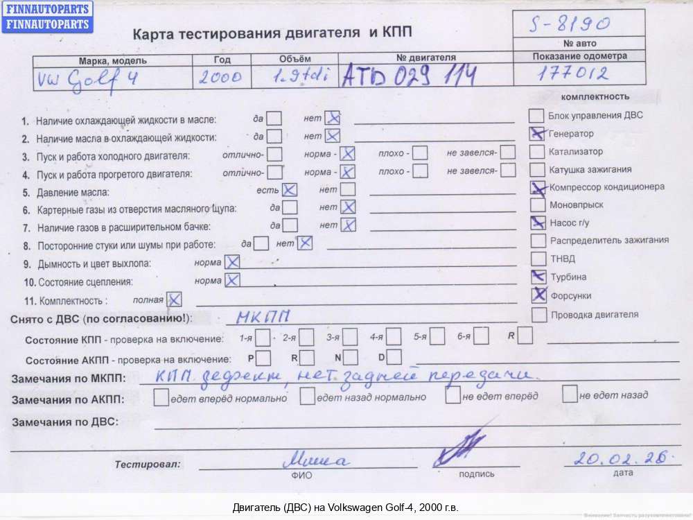 | Кемерово | 2000 | 038100090CX, 038100090DX, 2000, 1.9л, Дизель, TDI, ALH, ALH259758, 038100090CX, 038100090DX, Универсал, Фото не актуально, с запчасти отделены: Патрубок охлаждения, ALH259758 | - | Г | К | С | Н | КК | ТУ, состояние ГРМ - нормально, поддон - нормально, прокручивается, клапанная крышка - нормально, эмульсия - нет, 2-массовый, снят стакан фильтра, | |||